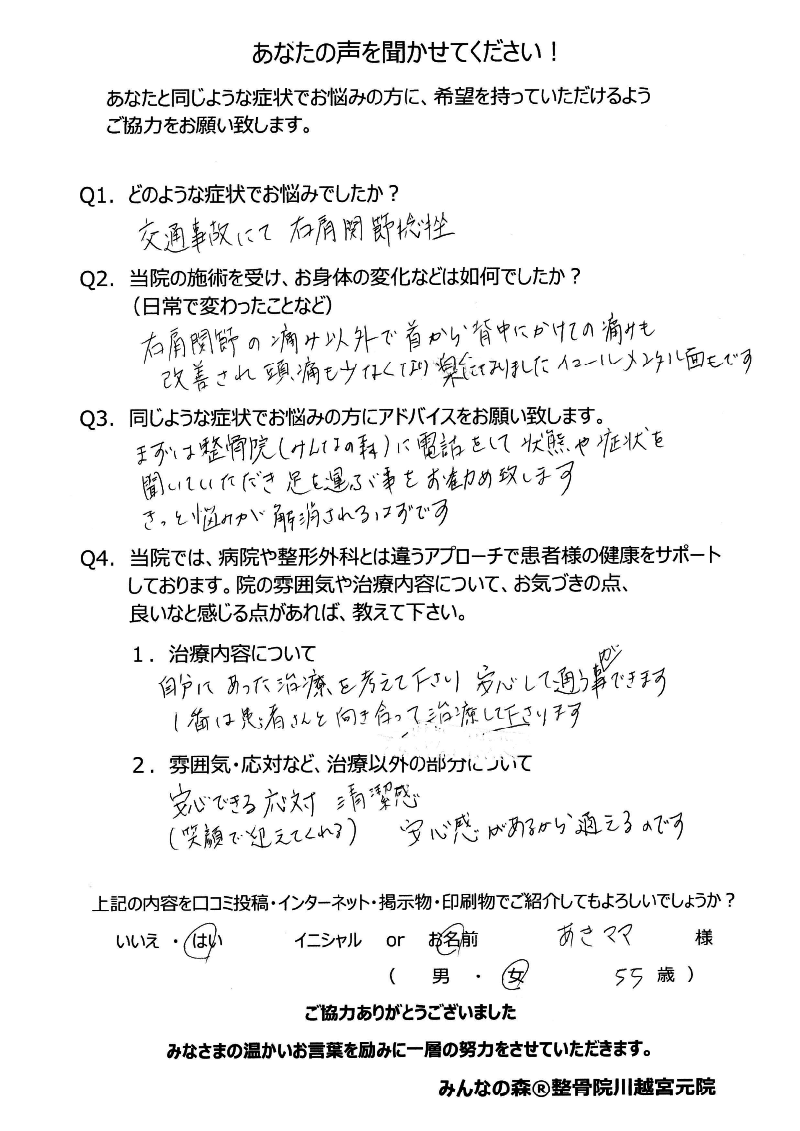 右肩関節の痛みだけでなく、首から背中にかけての痛みも改善され頭痛も少なくなり楽になり、メンタル面でも楽になりました。