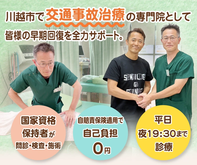 川越市の「みんなの森®整骨院 川越宮元院」には、川越市全域から交通事故に遭われて不調をかかえる方やリハビリに悩まれる方が来院されています。