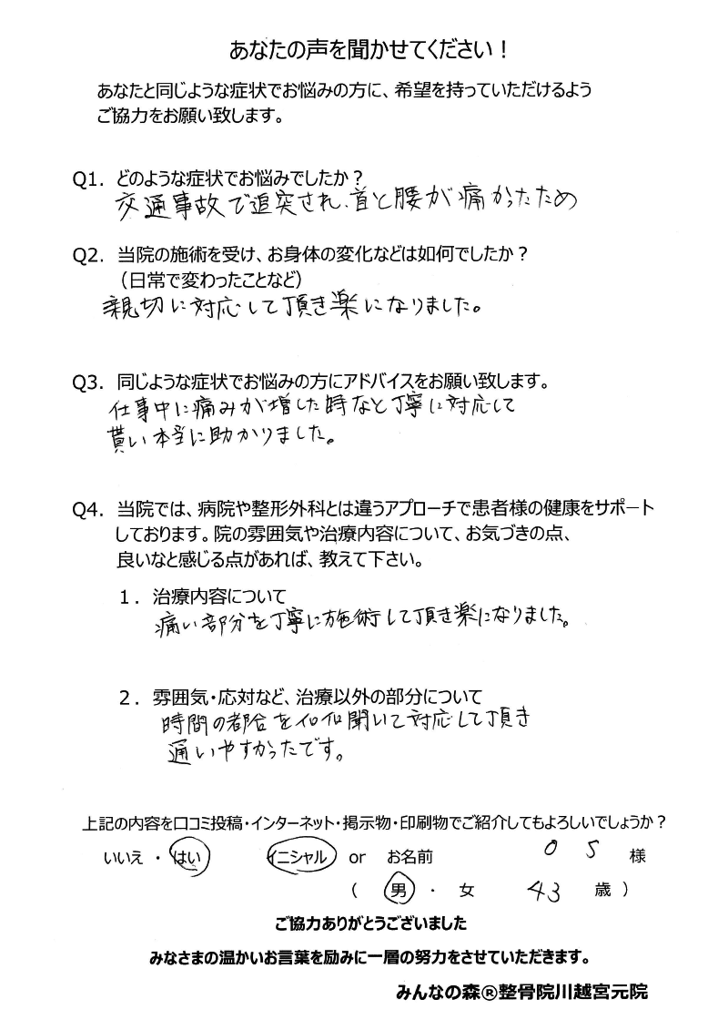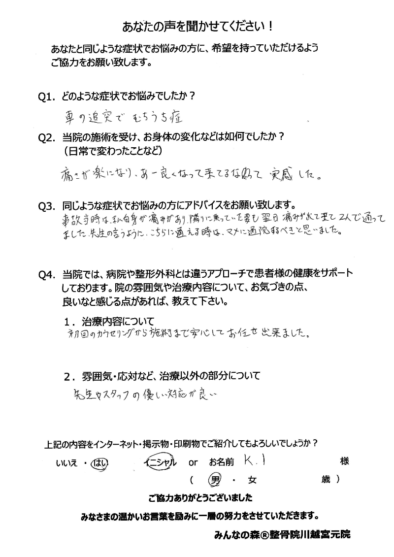 医師の立場から見ても、みんなの森整骨院 川越宮元院は、安心してご紹介できる信頼できる治療院です。交通事故後の不調でお悩みの方は、ぜひ一度相談されることをおすすめいたします。