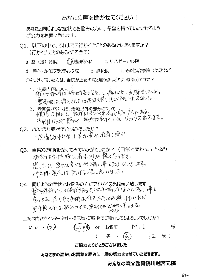整形外科では診断名の告知と痛み止め、ぬり薬の処方でしたが、みんなの森整骨院川越宮元院は、痛みの出ている原因を探り、そこへアプローチしてくれます。また、話を傾聴して頂けて、症状の説明もしてくれるので安心感がありました。予約優先制なので静かで、施術を受けている間もリラックス出来ました。整形外科では注射(3回まで)か手術しかないと恐ろしい事を言われましたが、利き手の手術は不安しかありませんでした。私のように手術を避けたい方は、みんなの森整骨院川越宮元院へ行き根本から治療するのがベストと思います。(M.I様 女性 52歳)