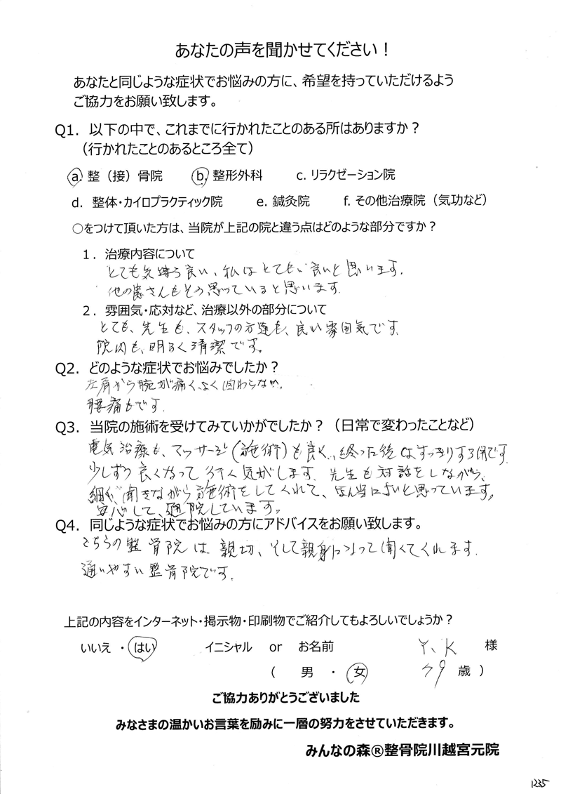 左肩から腕が痛く、腕が回らなくなりました。また、腰痛もありました。みんなの森整骨院川越宮元院さんの施術は、とても気持ち良く、私はとてもいいと思います。他の患者さんもそう思っていると思います。