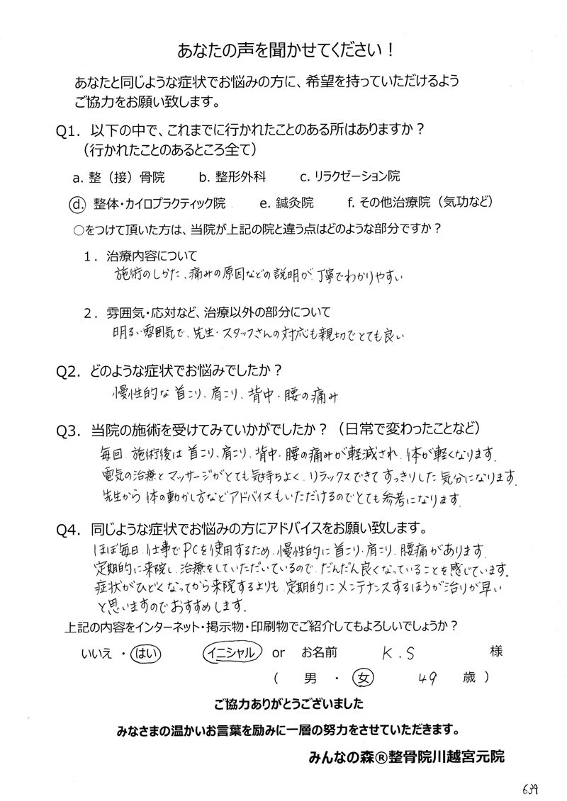 慢性的な「首こり」「肩こり」「背中や腰の痛み」で悩んでいました。みんなの森整骨院川越宮元院さんは、痛みの原因などの説明が丁寧でわかりやすく、院の雰囲気も明るくて、先生もスタッフさんの対応も親切でとても良い感じです。毎回施術後は「首こり」「背中」「腰」の痛みが軽減され、体が軽くなります。電気の治療とマッサージがとても気持ちよく、リラックスできてすっきりした気分になれます。先生から体の動かし方などのアドバイスもいただけるのもとても参考になります。ほぼ毎日仕事でパソコンを使用するため、慢性的に「首こり」「肩こり」「腰痛」があり、こちらに定期的に来院して治療をしていただいているのですが、だんだん良くなっていることを感じています。症状がひどくなってから来院するよりも、定期的にメンテナンスするほうが治りも早いと思いますのでおすすめします。(K.S様 女性 49歳)
