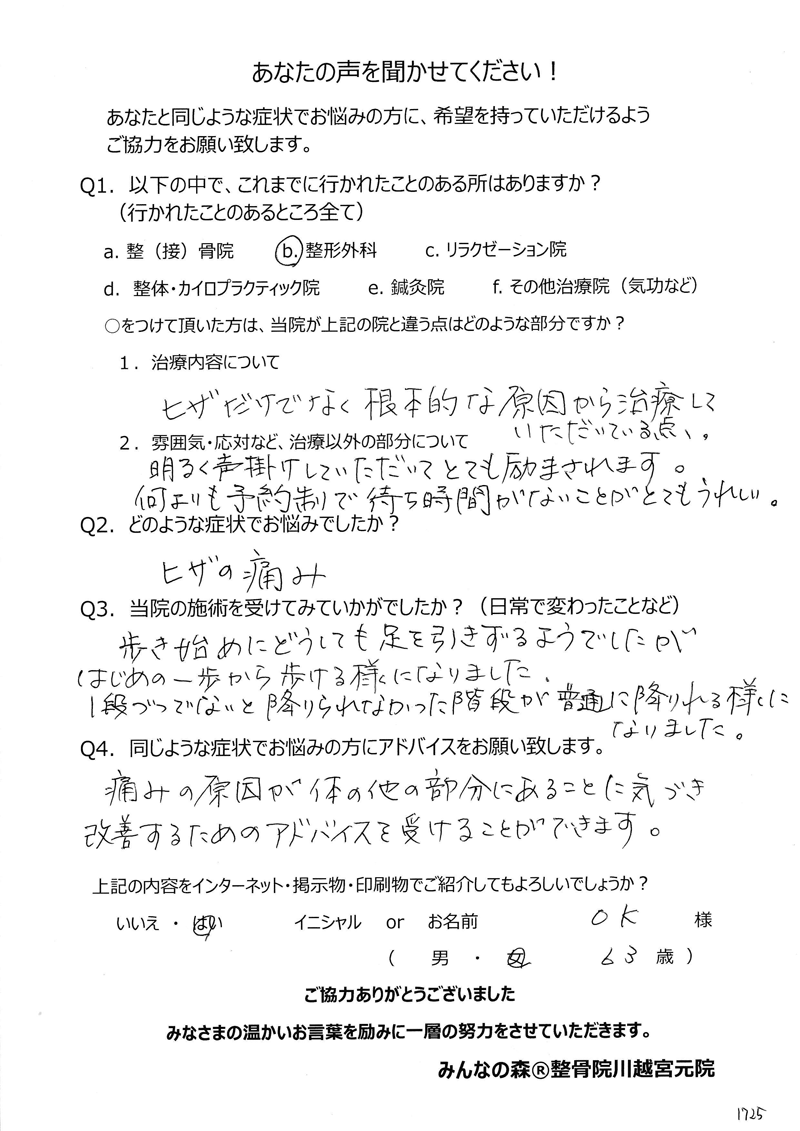 ひざの痛みでみんなの森整骨院 川越宮元院さんに通院しています。ヒザだけでなく根本的な原因から治療してもらえるのがとてもいいです。また、先生やスタッフの方に明るく声掛けしていただいてとても励まされます。治療してもらう前は、歩き始めにどうしても足を引きずるようでしたが、今では初めの一歩からスムーズに歩ける様になりました。階段も、一段ずつでないと降りられなかったのが普通に降りられる様になりました。