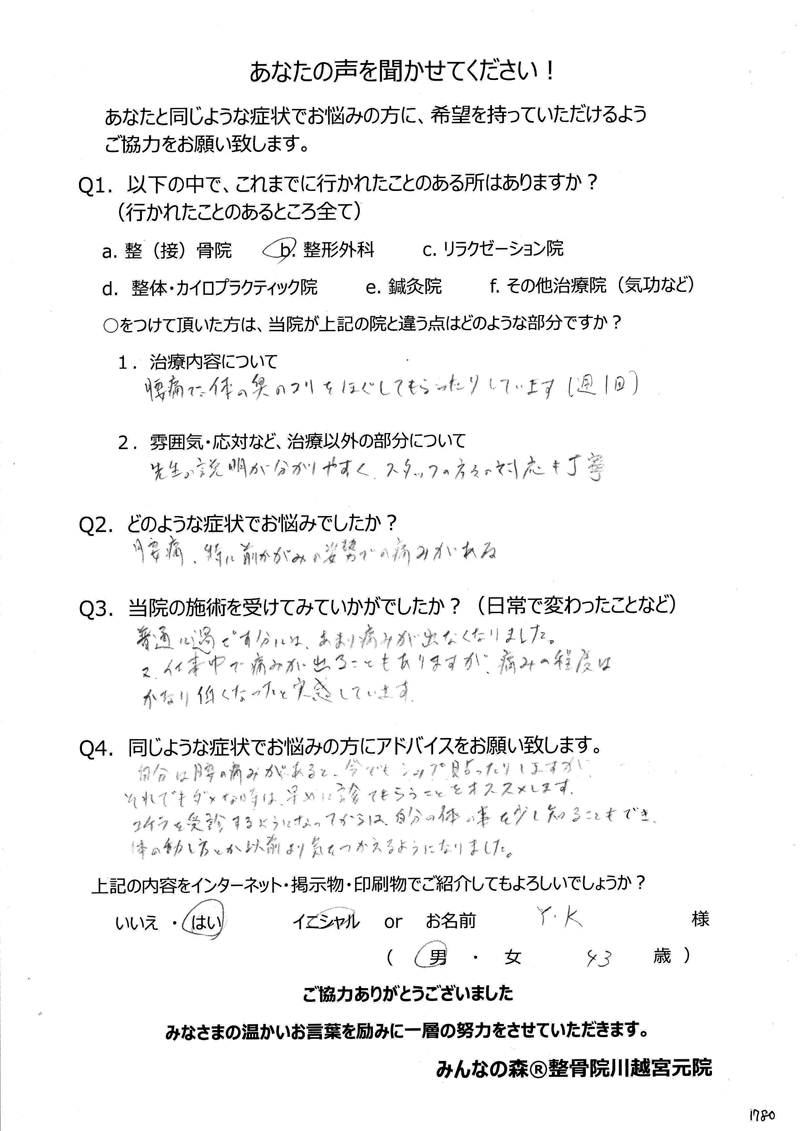 みんなの森整骨院 川越宮元院さんは、先生の説明がわかりやすく、スタッフの方の対応も丁寧です。私は、前かがみの姿勢の時に腰に痛みがあり、週に1回通院して、体の奥のコリをほぐしてもらったりしています。施術してもらい、日常生活での痛みが出なくなりました。たまに、仕事中に痛みが出ることもありますが、痛みの程度はかなり低くなったと実感しています。腰痛の時は、早い時期にみんなの森整骨院 川越宮元院さんに診てもらうことをお勧めします。私は、こちらを受診するようになって、自分の体のことを少し知ることができました。体の動かし方などなども以前より気をつけるようになりました。(Y.K様 男性 43歳)