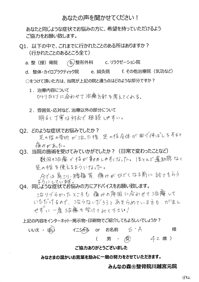 足の指の骨折が治った後に、足指の曲げ伸ばしをすると足全体に痛みがあり、みんなの森整骨院 川越宮元院さんに通いました。数回の治療で指が動かしやすくなり、ほとんど違和感なく足の指を使えるようになりました。今では、「肩こり」「腰痛」など、痛みがひどくなる前に診てもらうようにしています。薄葉先生は、明るく丁寧な対応で相談しやすい先生で、いつも私に合わせて治療方針を考えてくれます。みんなの森整骨院 川越宮元院さんは、治りづらかったところも痛みの原因に合わせて治療していただけるので、治らないだろうとあきらめている方も、がまんせずに一度治療を受けてみて下さい!(S.A様 女性 42歳)