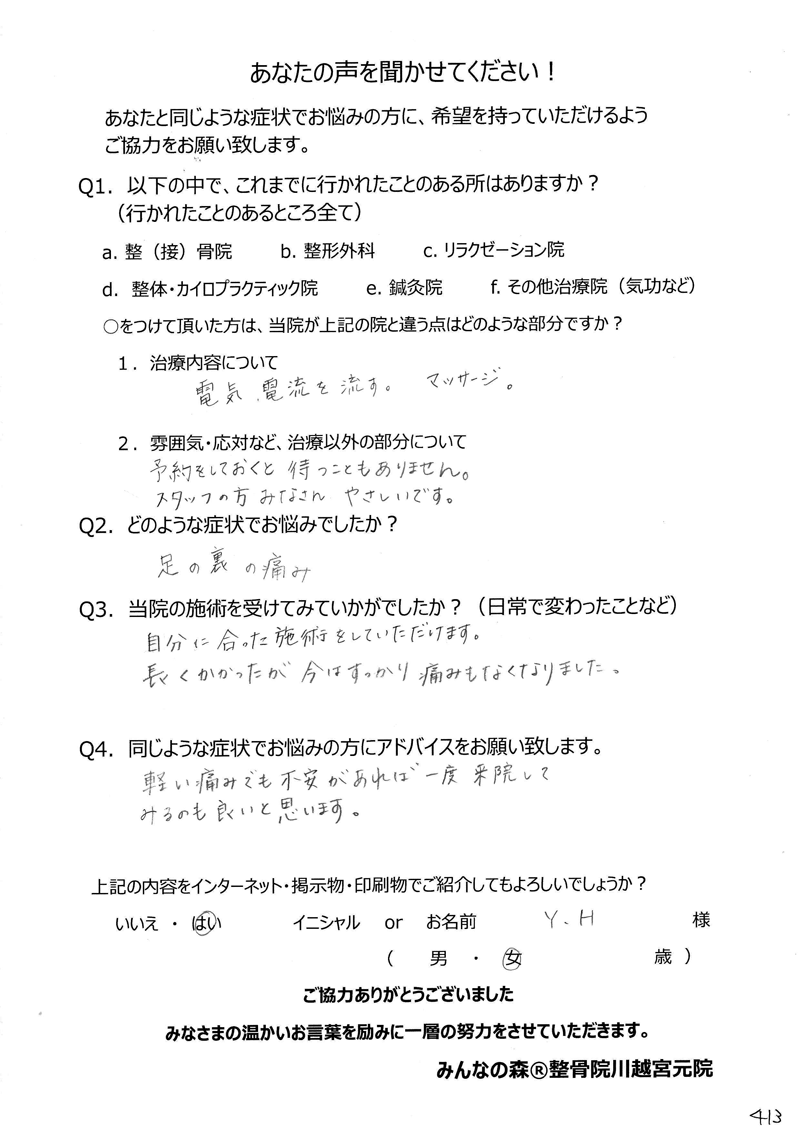 通院して、今はすっかり痛みもなくなりました。軽い痛みでも不安がある方は、一度来院してみると良いと思います。(Y.H様 女性)