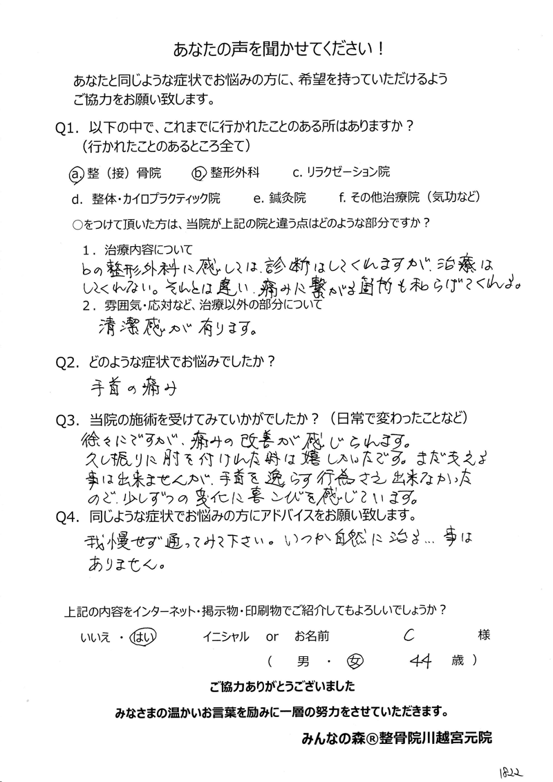 手首の痛みで、みんなの森整骨院 川越宮元院に通っています。整形外科では診断だけで、治療はしてくれないと感じましたが、こちらでは痛みに繋がる原因の箇所も和らげてもらい、徐々にですが、痛みの改善が感じられます。久し振りに頬杖がつけた時は嬉しかったです。まだ、支える事は出来ませんが、はじめは手をそらすことさえ出来なかったので、少しずつの変化に喜びを感じています。治療しないままにしておいても、いつか自然に治る事はありません。痛みは、我慢せずにみんなの森整骨院 川越宮元院さんに通ってみて下さい。(C様 女性 44歳)