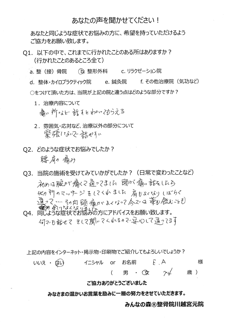みんなの森整骨院 川越宮元院さんは、痛い所などの話をするとわかってもらえるし、緊張しないで話せます。何でも話せて、そして聞いてくれるので安心して通ってます。(E.A様 女性 74歳)