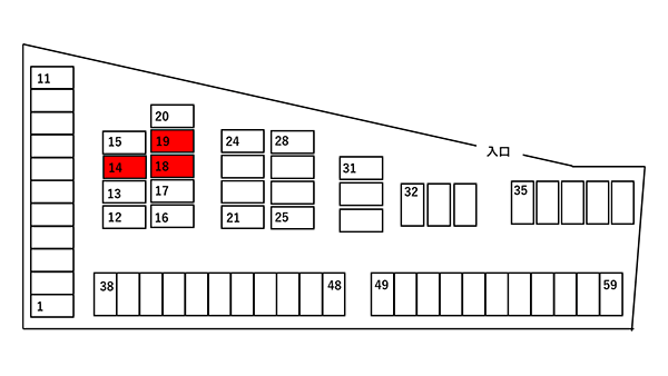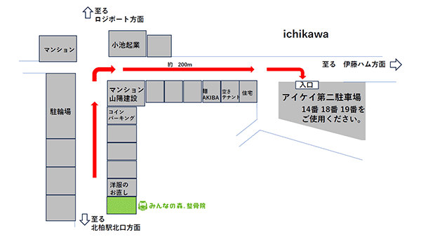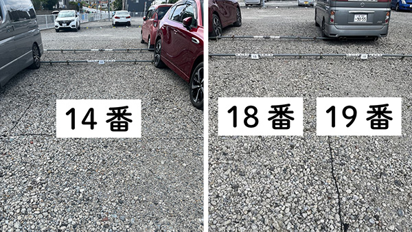 山陽建設さんと小池起業さんの角を右に曲がり、200mほど進んだ右手にあるアイケイ第二駐車場の、14番・18番・19番をご使用ください。
