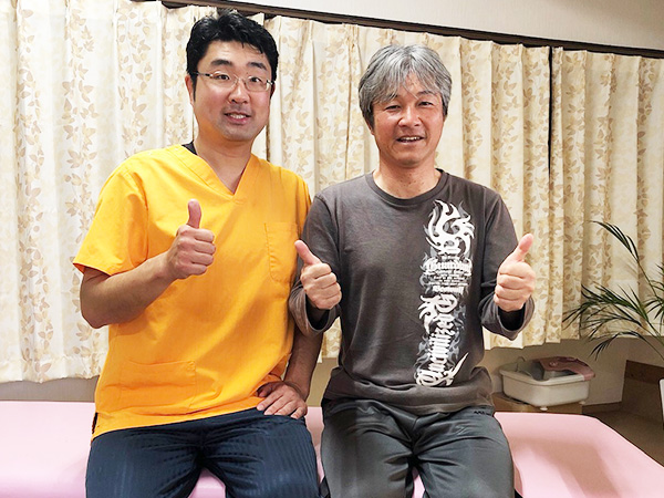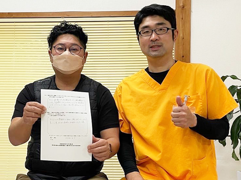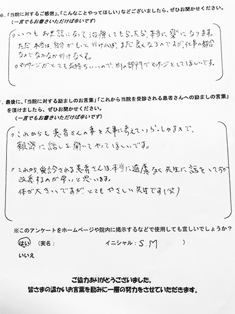 いつもお世話になっており、治療してもらうと本当に楽になります。本当は自分が行ければもっと良くなるのですが、仕事の都合でなかなか行けないでいます。マッサージがとても気持ちいいので別のメニューでマッサージをして欲しいです。これからも患者さんのことを大事に考えて、親密に話を聞いてあげて欲しいです。これから受診される患者さんは、遠慮なく先生に話をしたほうが早く改善すると思います。体は大きいですが、とても優しい先生です。(笑)(S.M様)