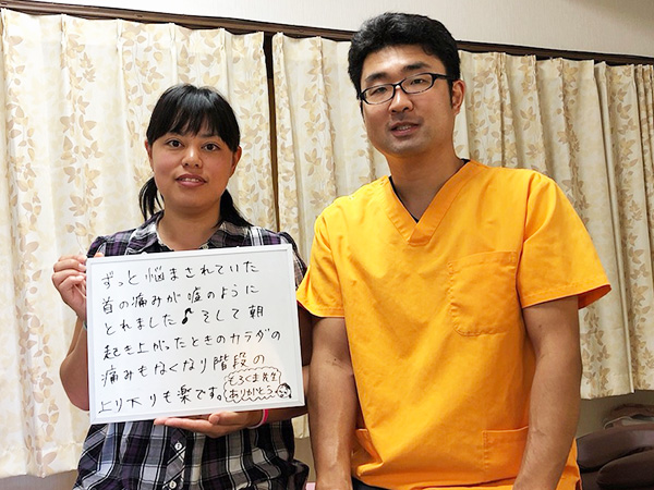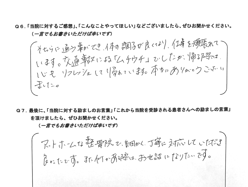 交通事故によるむち打ちで来院しました。おかげで身体の調子がよくなり、仕事をがんばれています。帰る際は心もリフレッシュして帰れています。本当にありがとうございました。