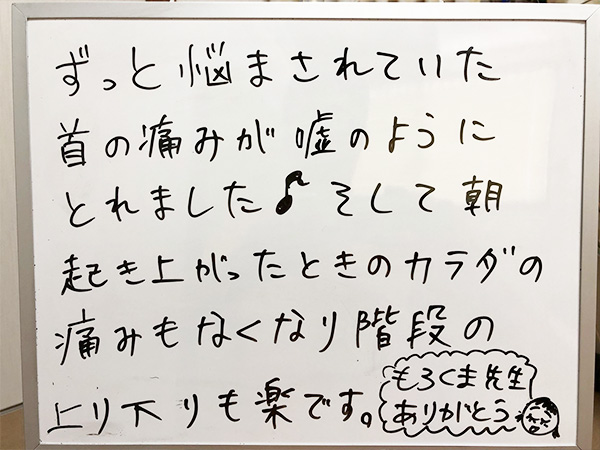 ずっと悩まされていた首の痛みが嘘のようにとれました。そして朝起き上がったときのカラダの痛みもなくなり階段の上り下りも楽です。もろくま先生ありがとう。(匿名希望)