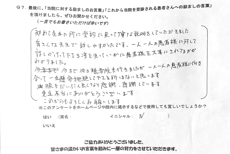 初めて先生のところに伺い、丁寧な説明をしていただけました。気さくな先生で、話しやすくてよかったです。一人ひとりの患者様に対して話しかけておられる姿を見て、いかに患者様を大事にされているかがわかりました。