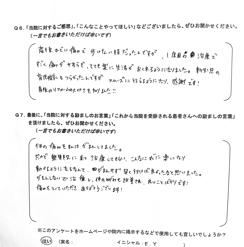 産後痛みがひどく、歩けないほどだったのですが一度の治療ですごく痛みがやわらぎ、とても楽に生活が送れるようになりました。つらかった新生児の育児、授乳もスムーズにおこなえるようになり、感謝しています。